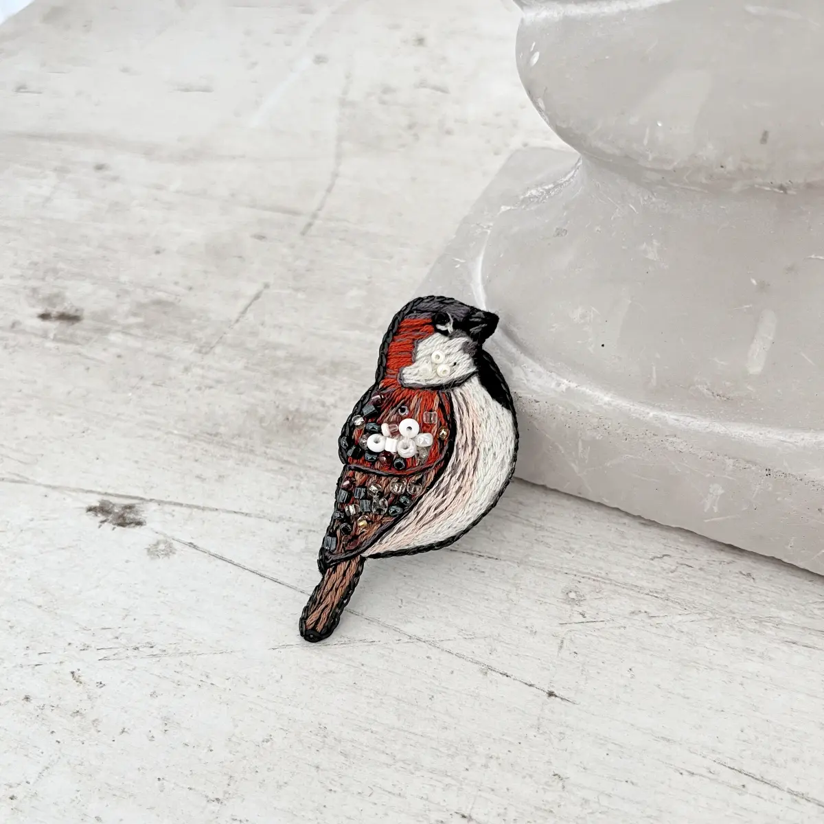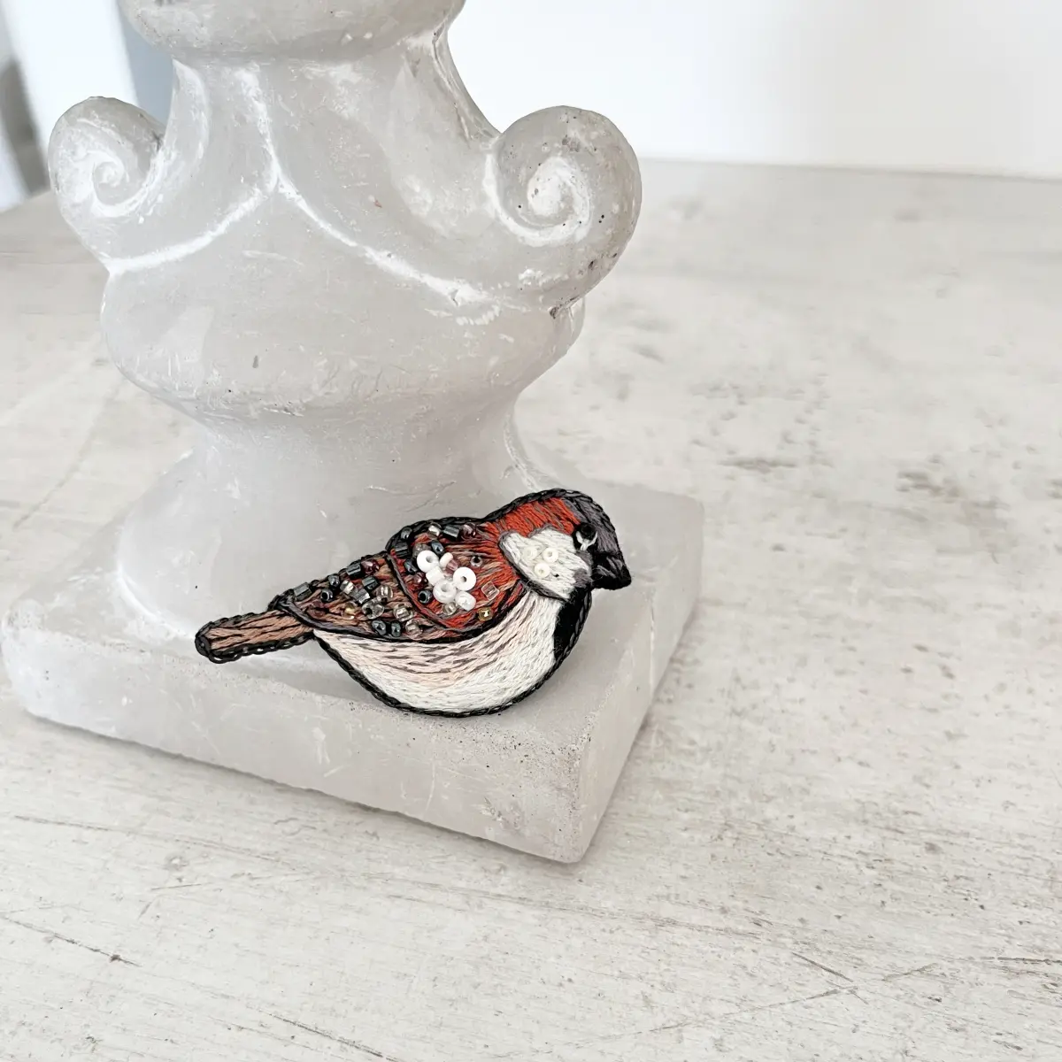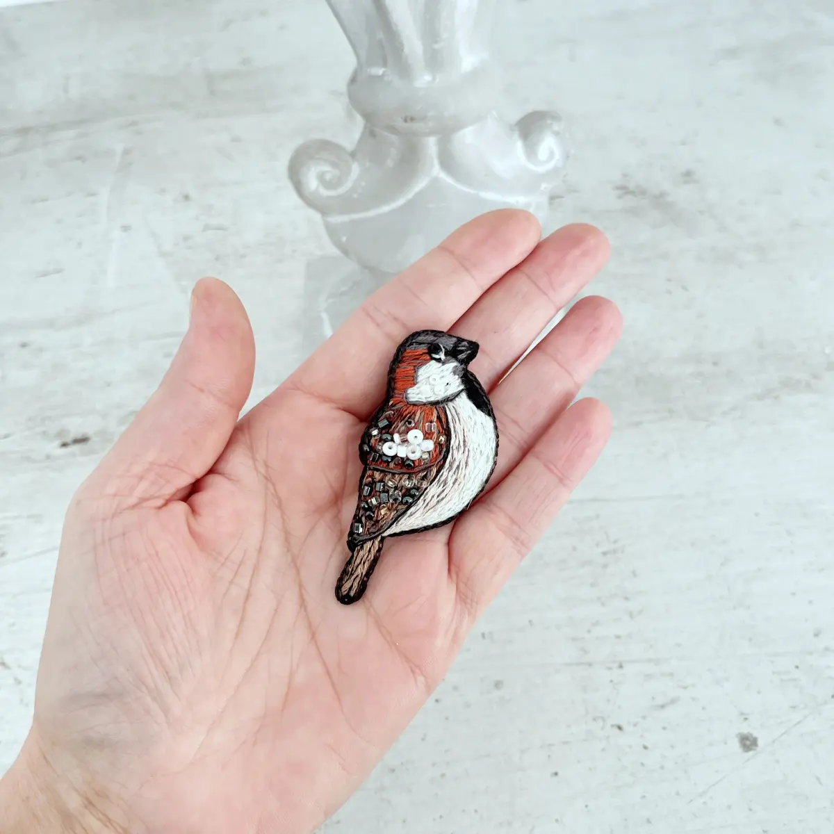 Ręcznie haftowana broszka WRÓBEL z serii POLSKIE PTAKI.